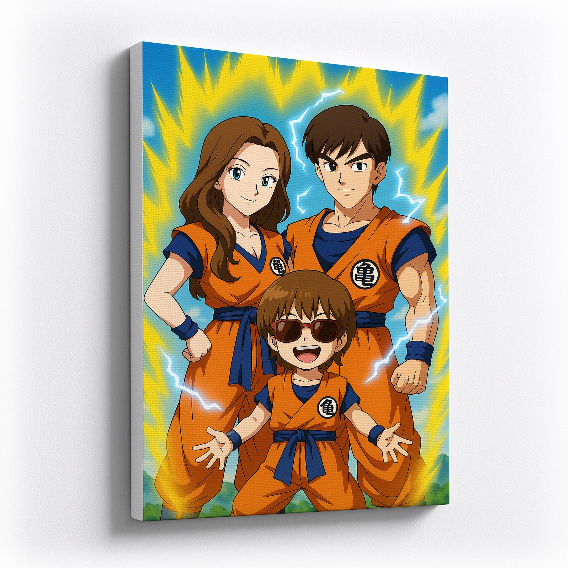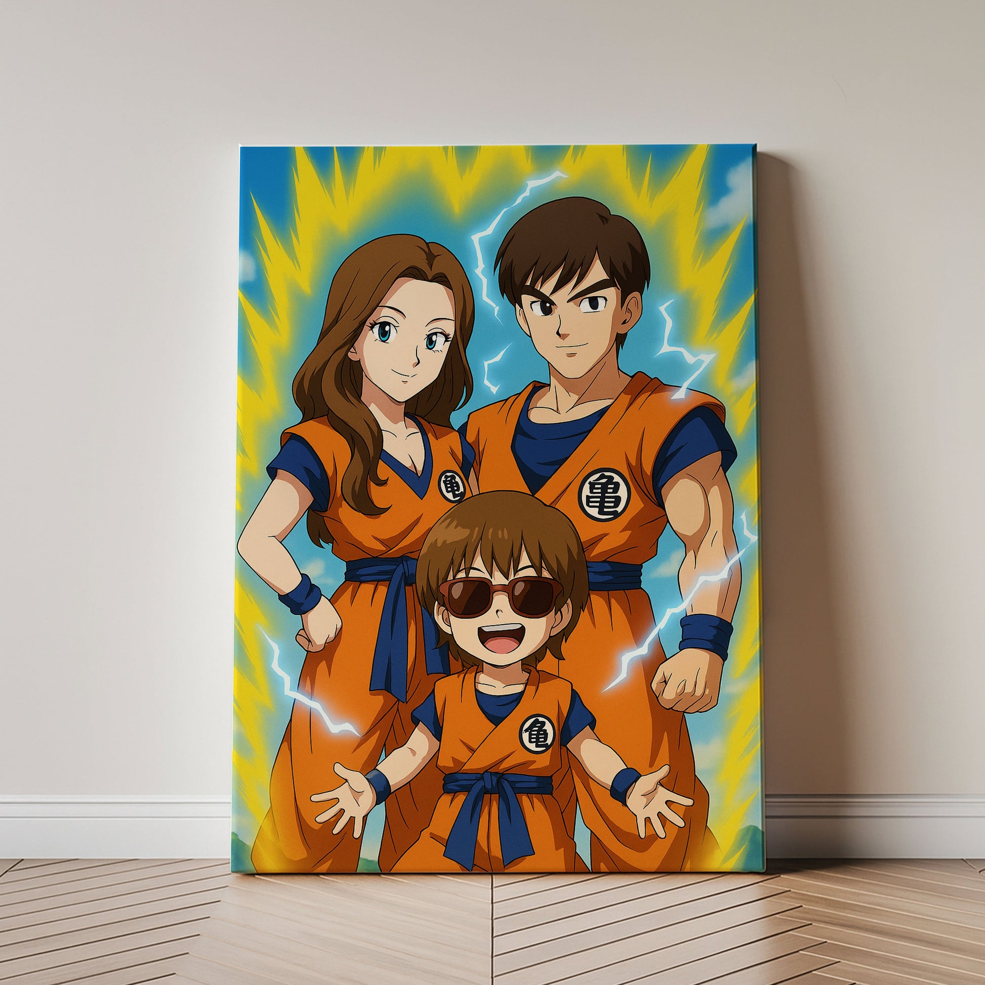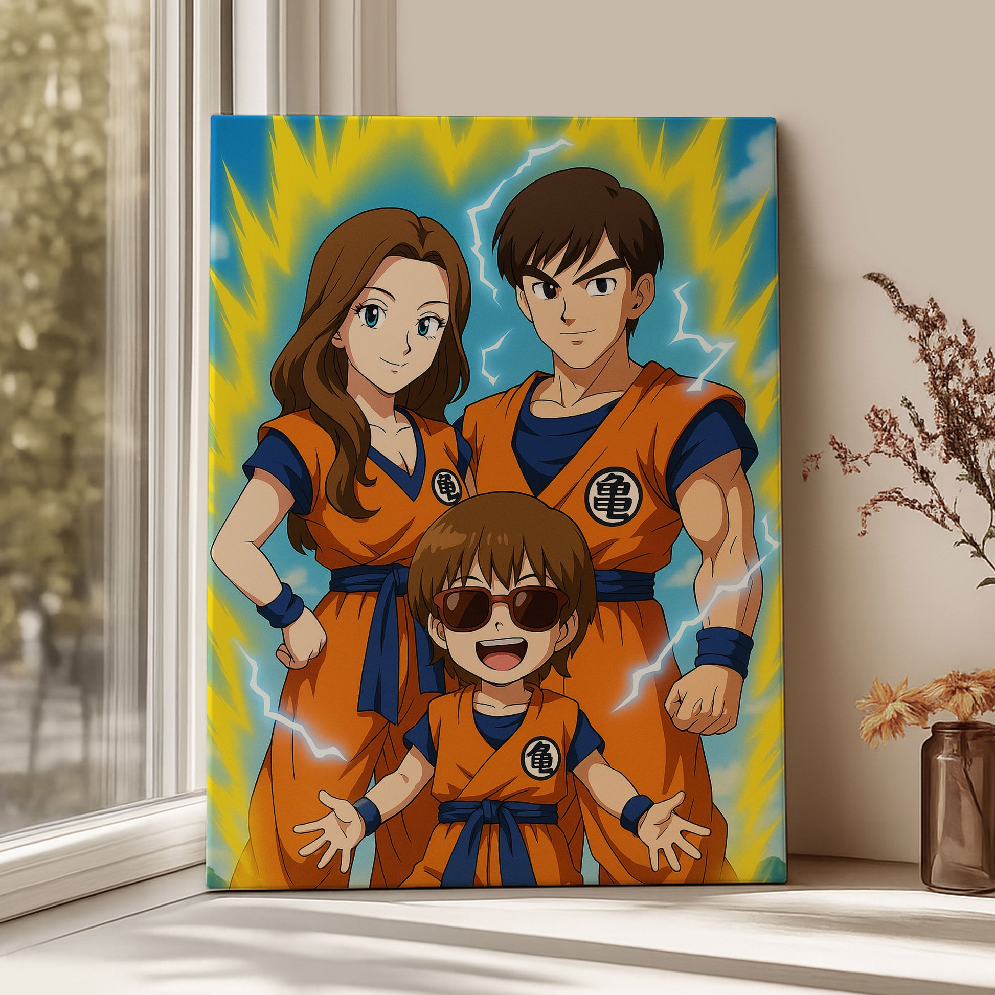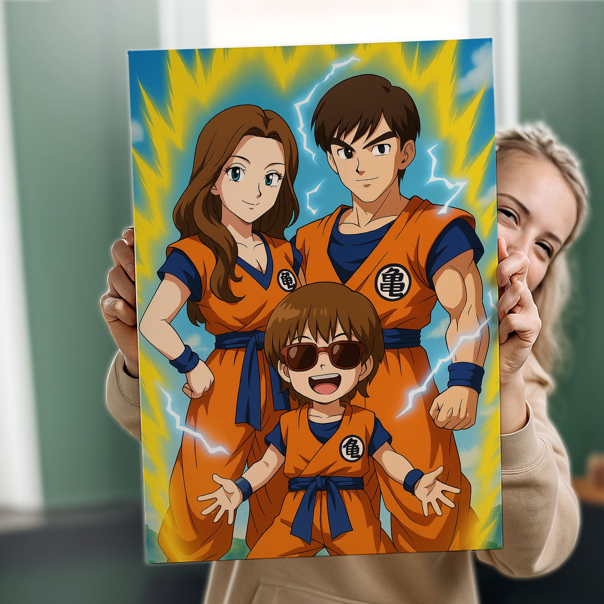Each canvas print is expertly personalized, turning your photo into a Dragon Ball-style character with all the strength, determination, and energy of your favorite Saiyan warriors. Whether it’s a special family moment, a favorite pet, or a heroic photo with friends, we bring your vision to life with Dragon Ball-inspired detail and flair.