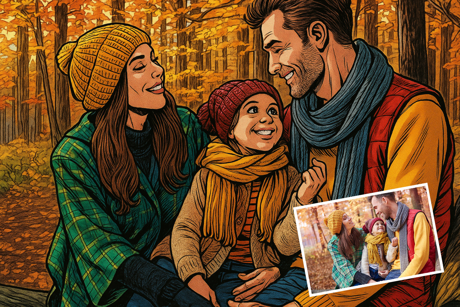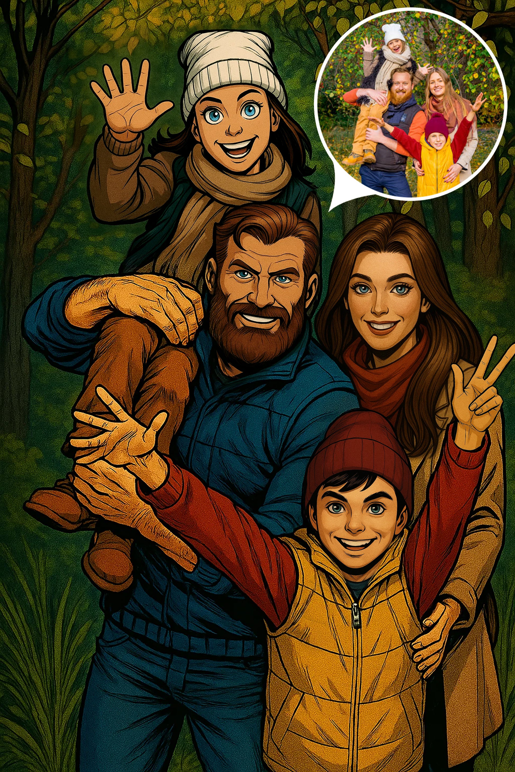 Our artists transform your photo into a bold, dynamic comic book illustration, capturing the power, fun, and energy of your loved ones in authentic superhero fashion. This one-of-a-kind DC-inspired artwork is the perfect way to showcase your family as the true heroes of your life.
