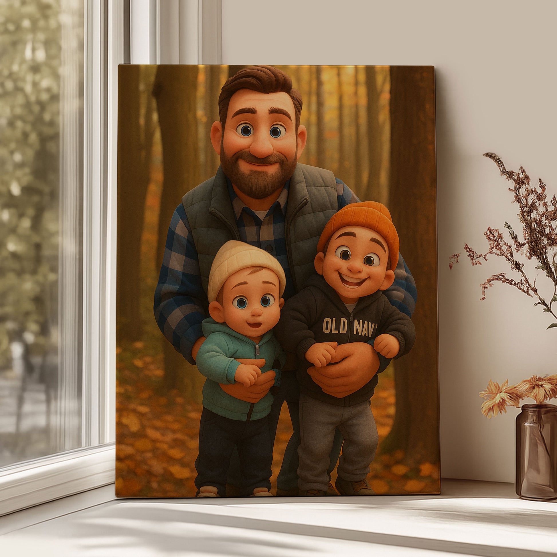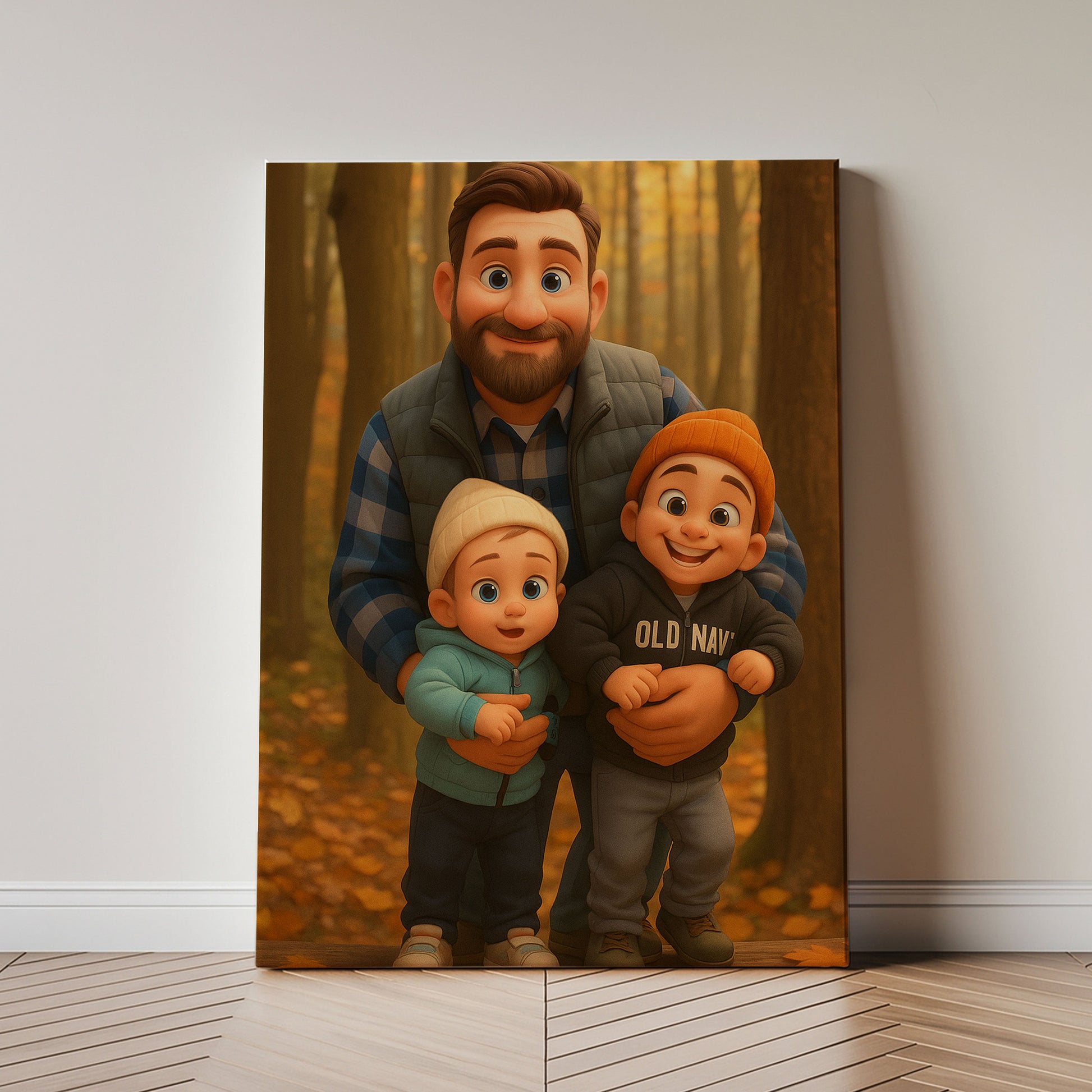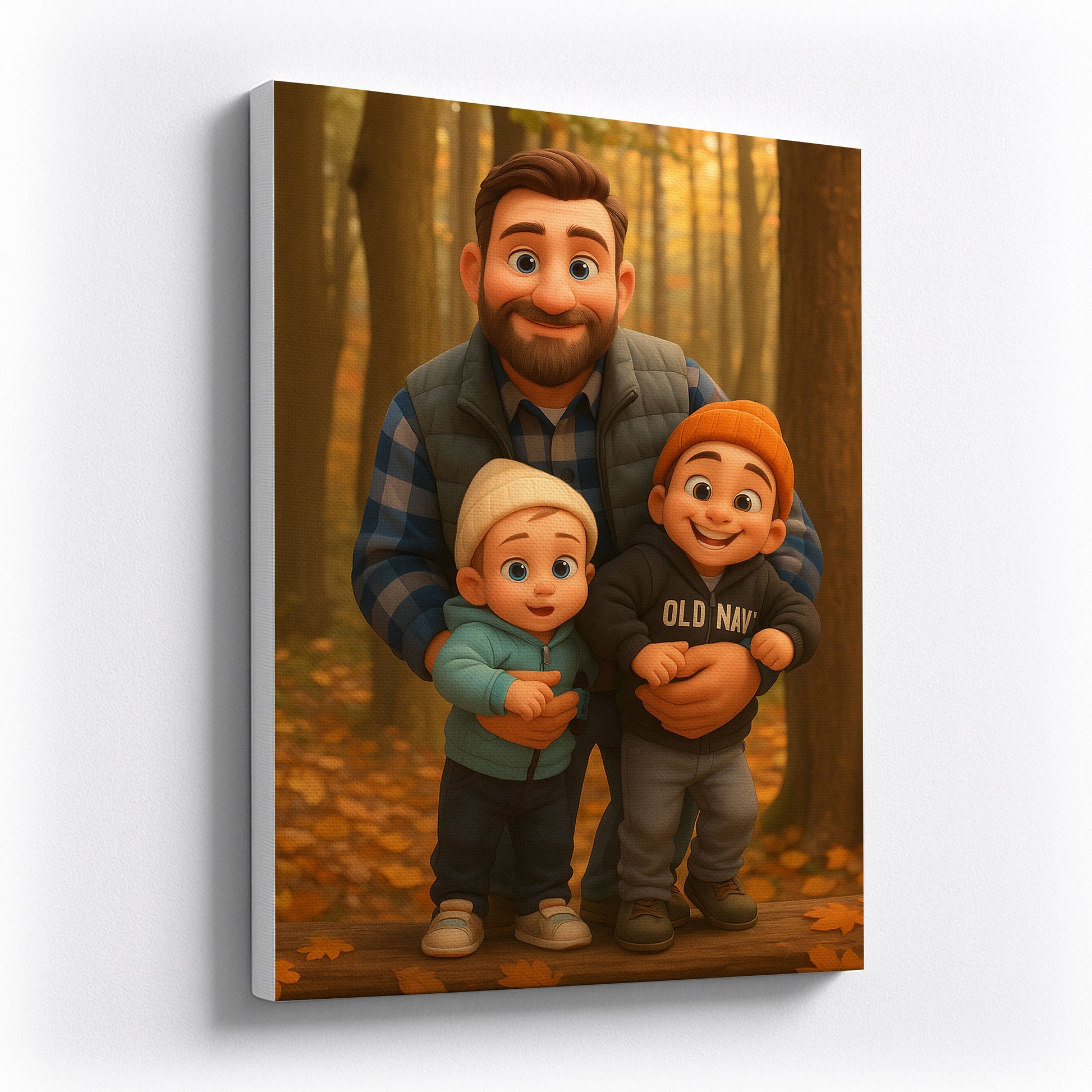 Celebrate the special bond between father and children with a Custom Disney Style Portrait in charming 3D animation detail. From your photo, we create a personalized cartoon illustration featuring you and your kids in warm, vibrant autumn scenery — just like a heartwarming moment from a Disney movie.