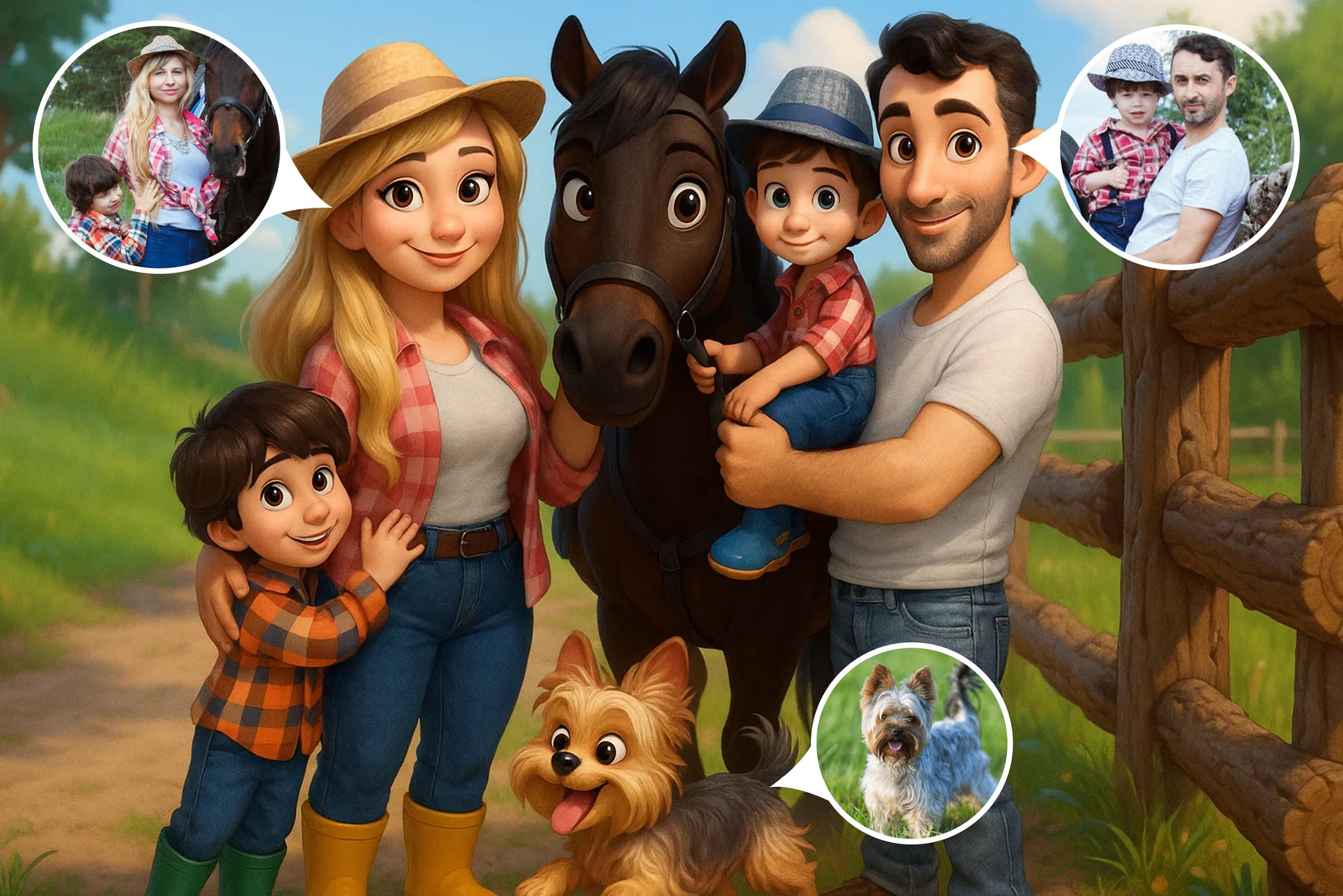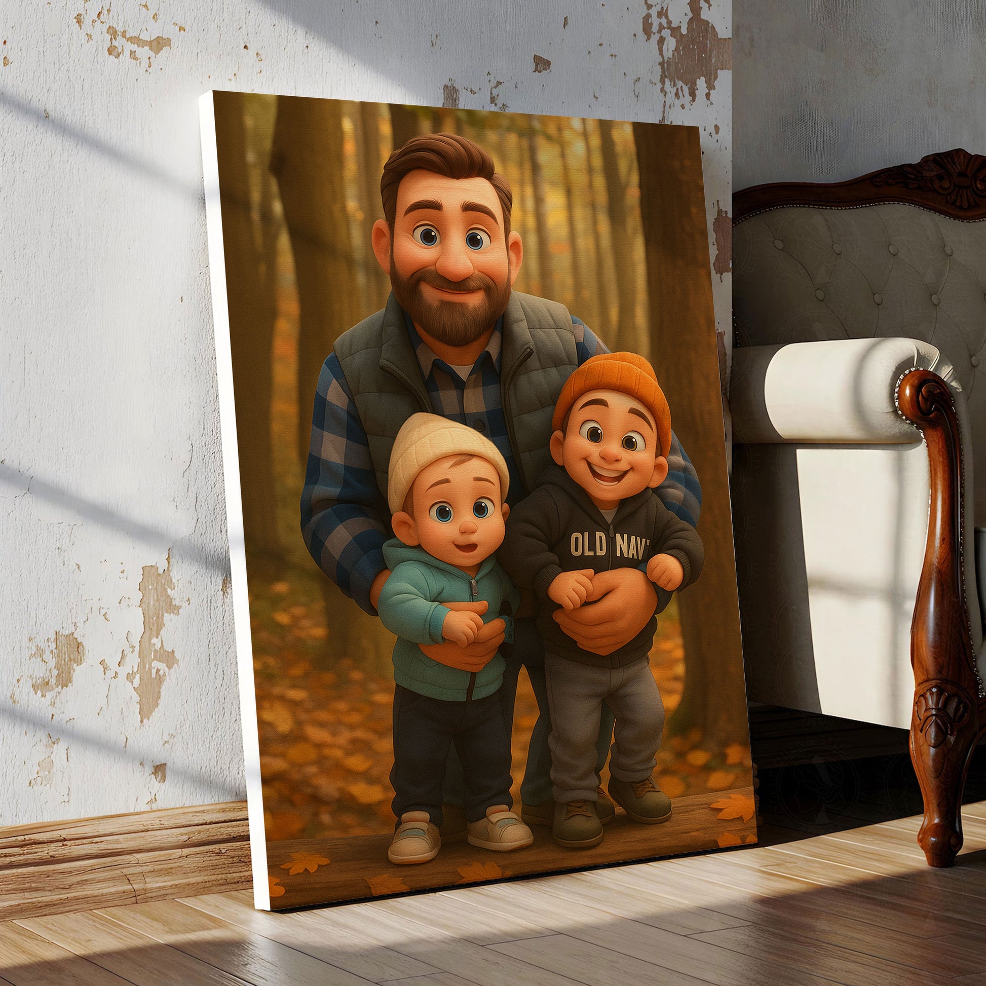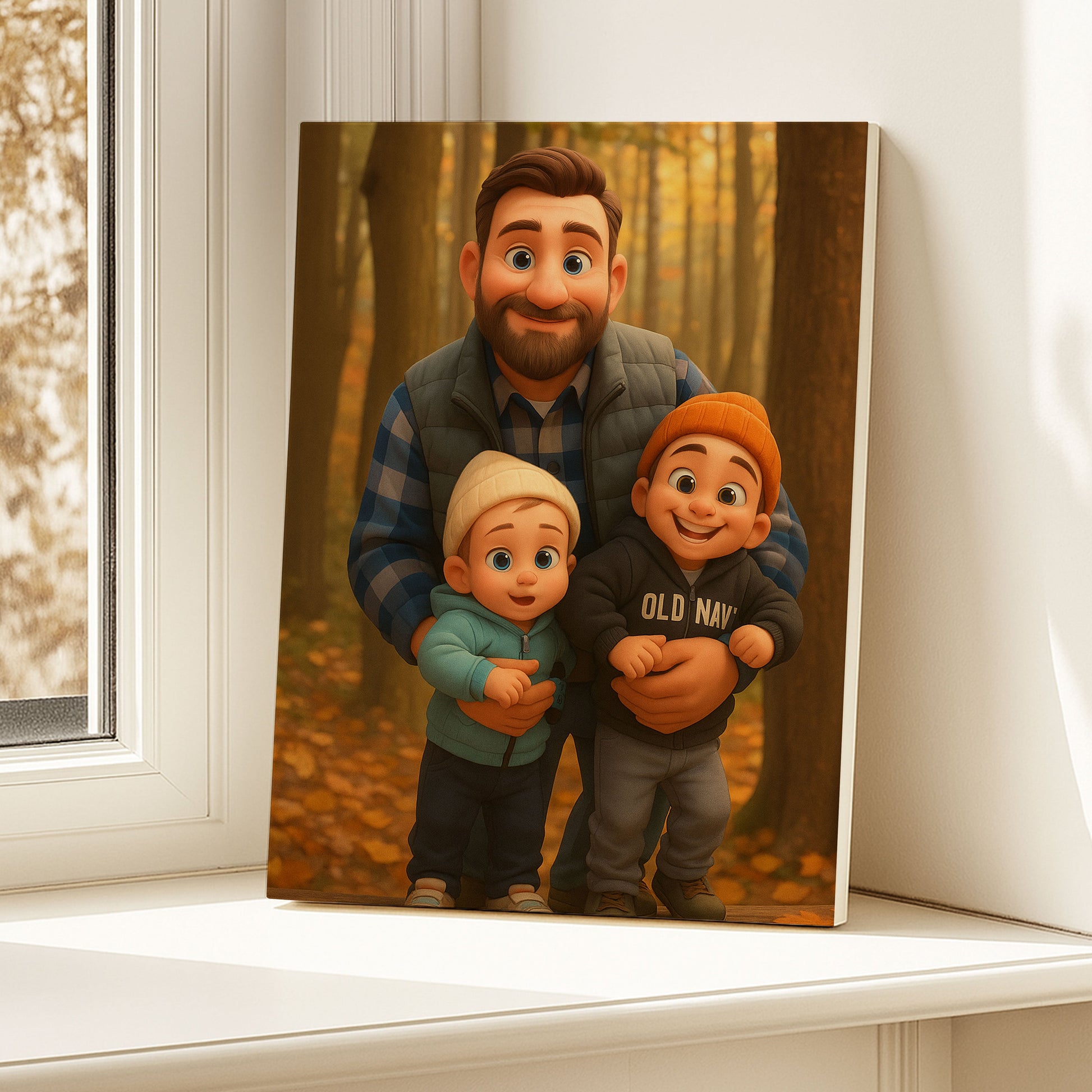 Celebrate the special bond between father and children with a Custom Disney Style Portrait in charming 3D animation detail. From your photo, we create a personalized cartoon illustration featuring you and your kids in warm, vibrant autumn scenery — just like a heartwarming moment from a Disney movie.