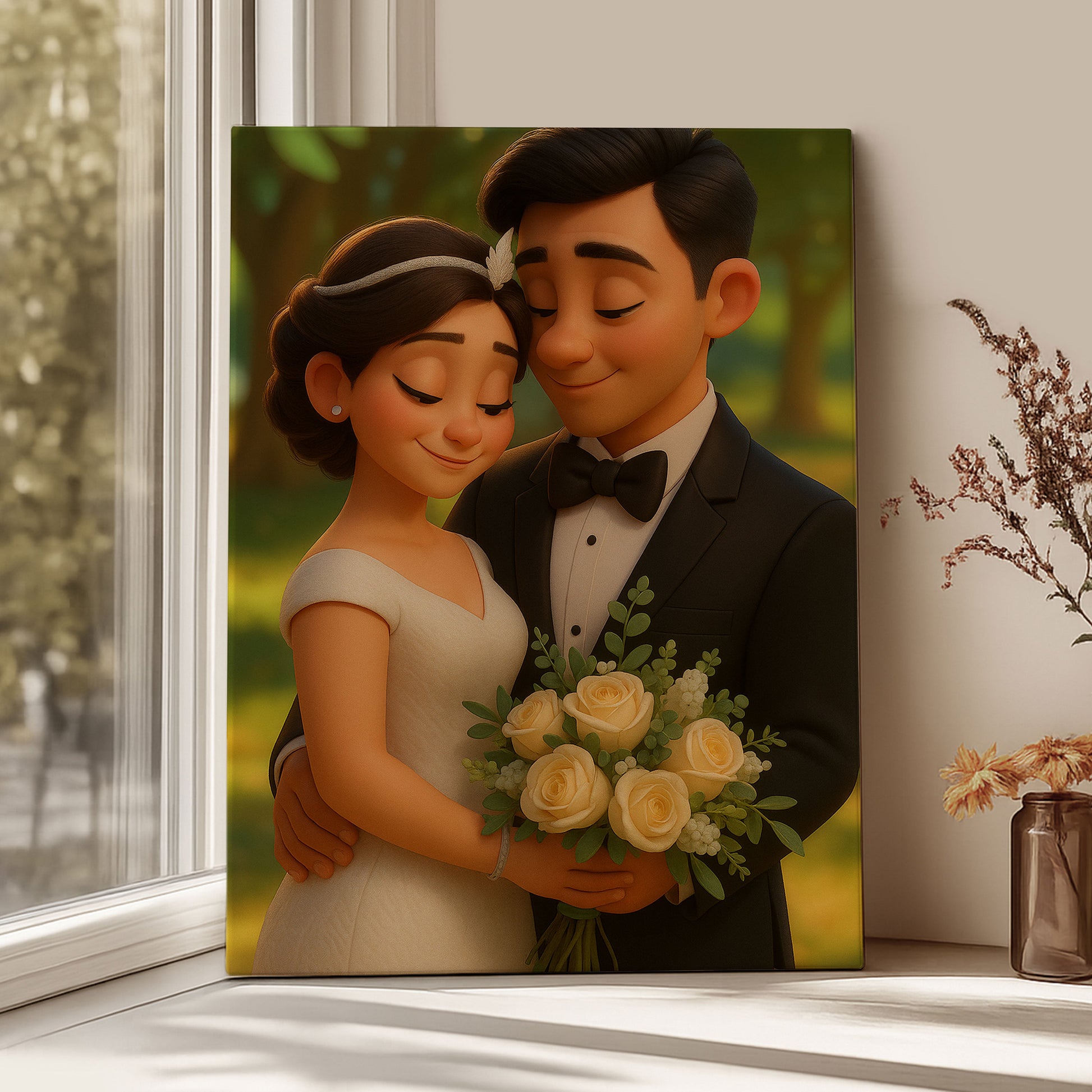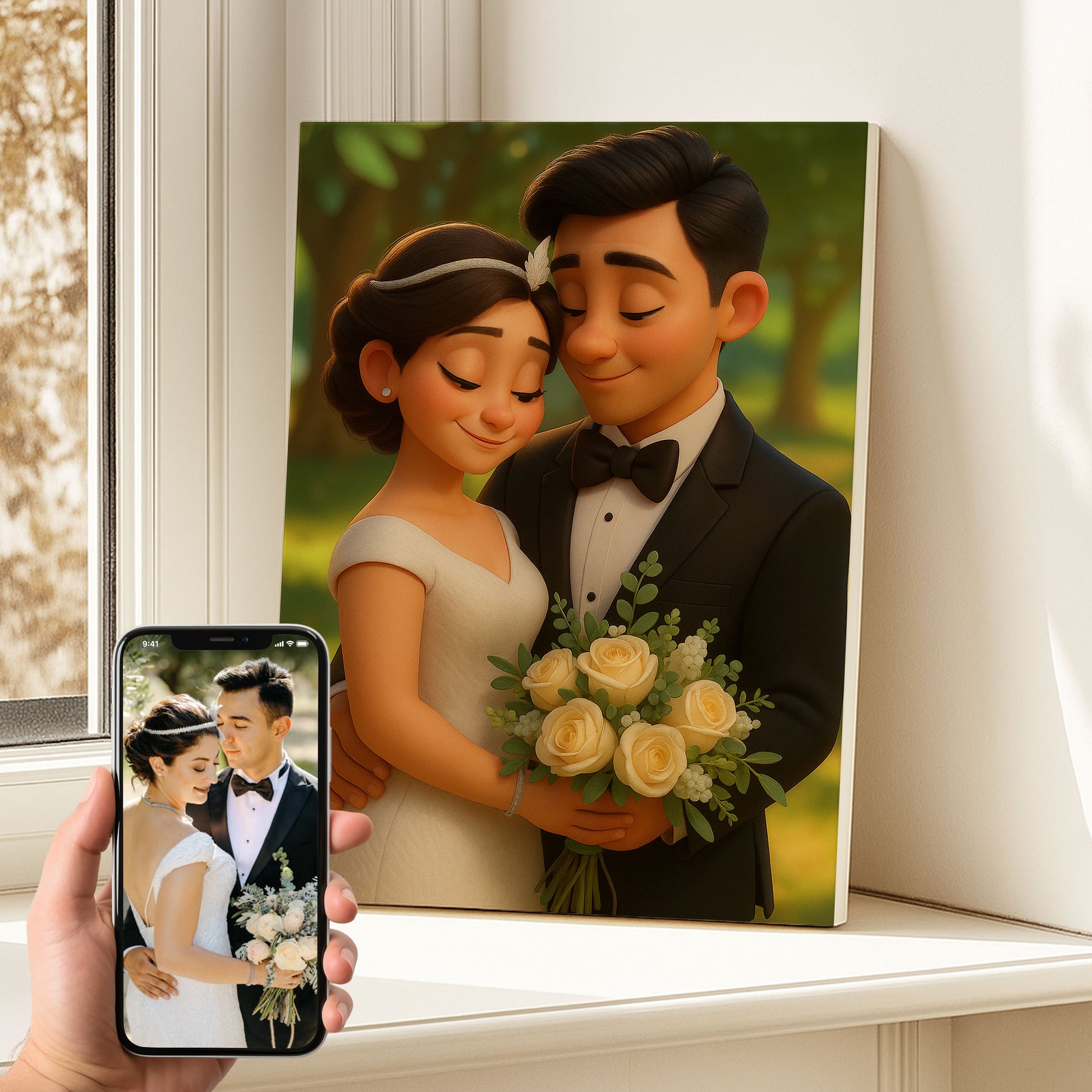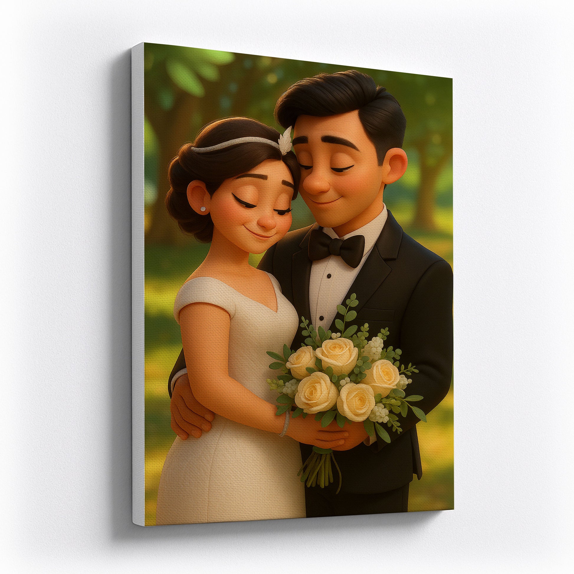 Turn your special day into a magical keepsake with a Custom Disney Couple Portrait inspired by the charm of Disney animation. From your wedding photo, we create a Disney-style art piece featuring you and your partner as elegant, storybook characters — complete with soft colors, expressive details, and a fairytale glow.